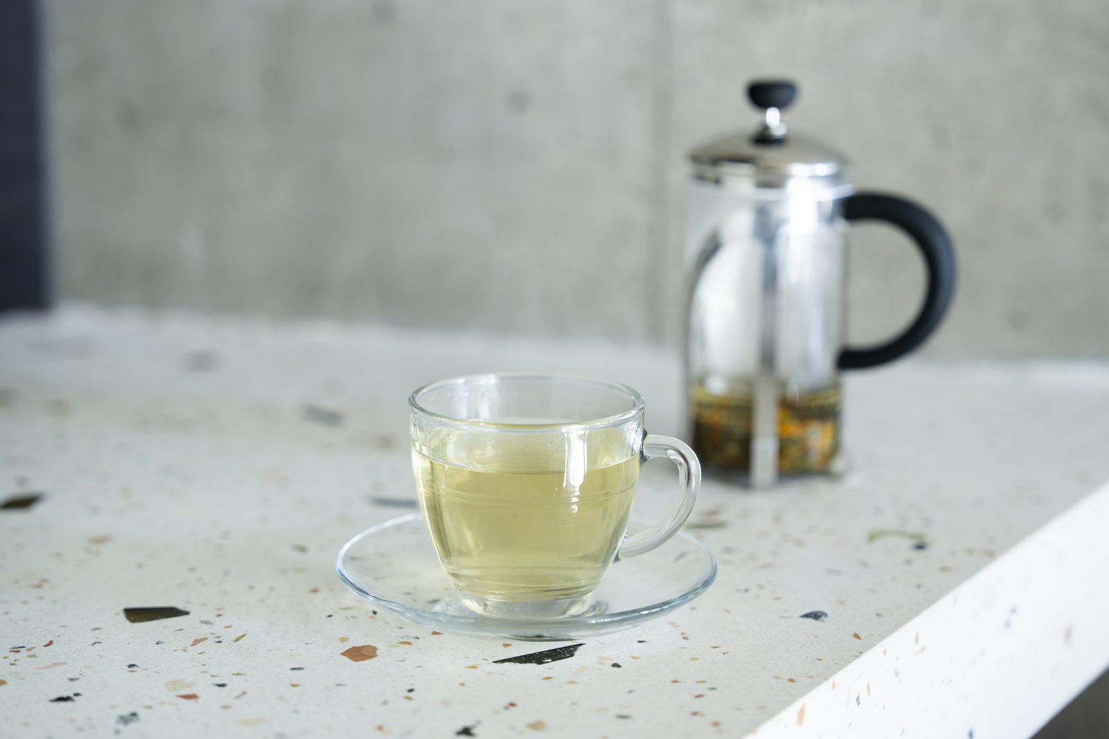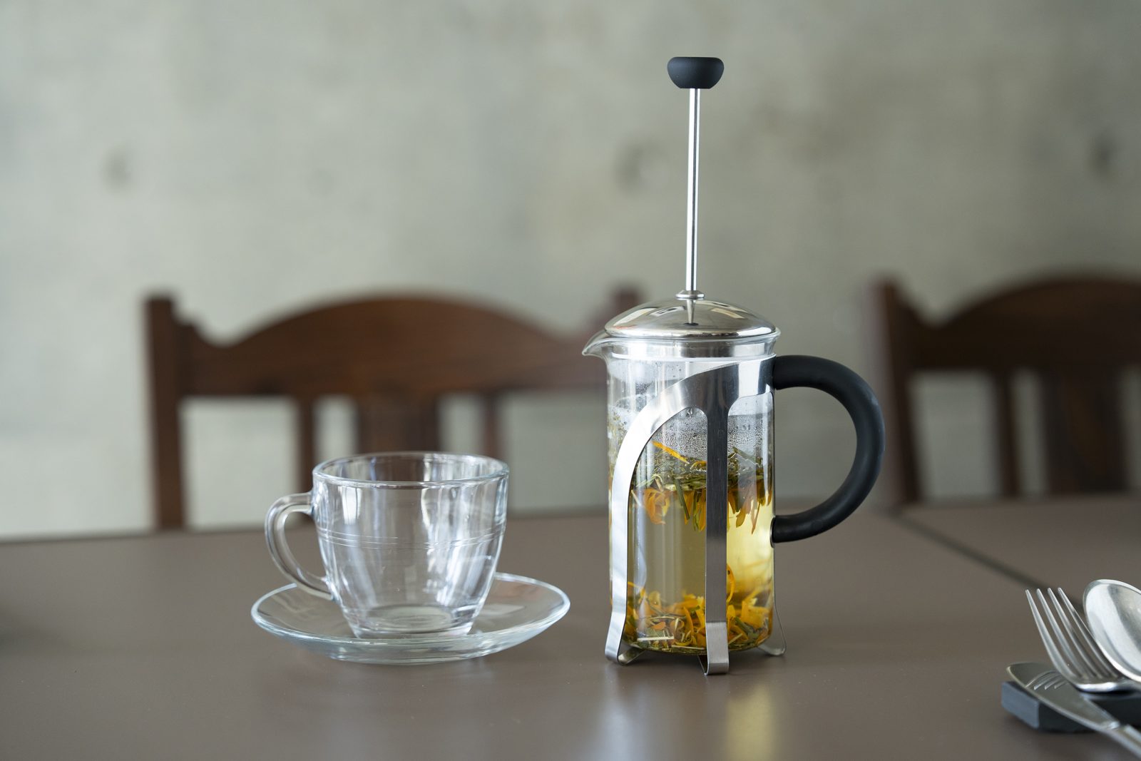 福島:バタコサンクは、ナチュマルワインストアの姉妹店としてやっているフレンチレストランなので、100%うちのセラーで扱わせていただいている日本ワインを料理と一緒に提供しております。香りや味わい、色味まで楽しむことのできるワインですから、ここではハーブティーの色も同様に楽しめるよう、フレンチプレスで淹れさせていただいています。コース料理の最後には「ひといき」「ひらめき」「月詠(つくよみ)」の3種類からハーブティーをお選びいただけます。