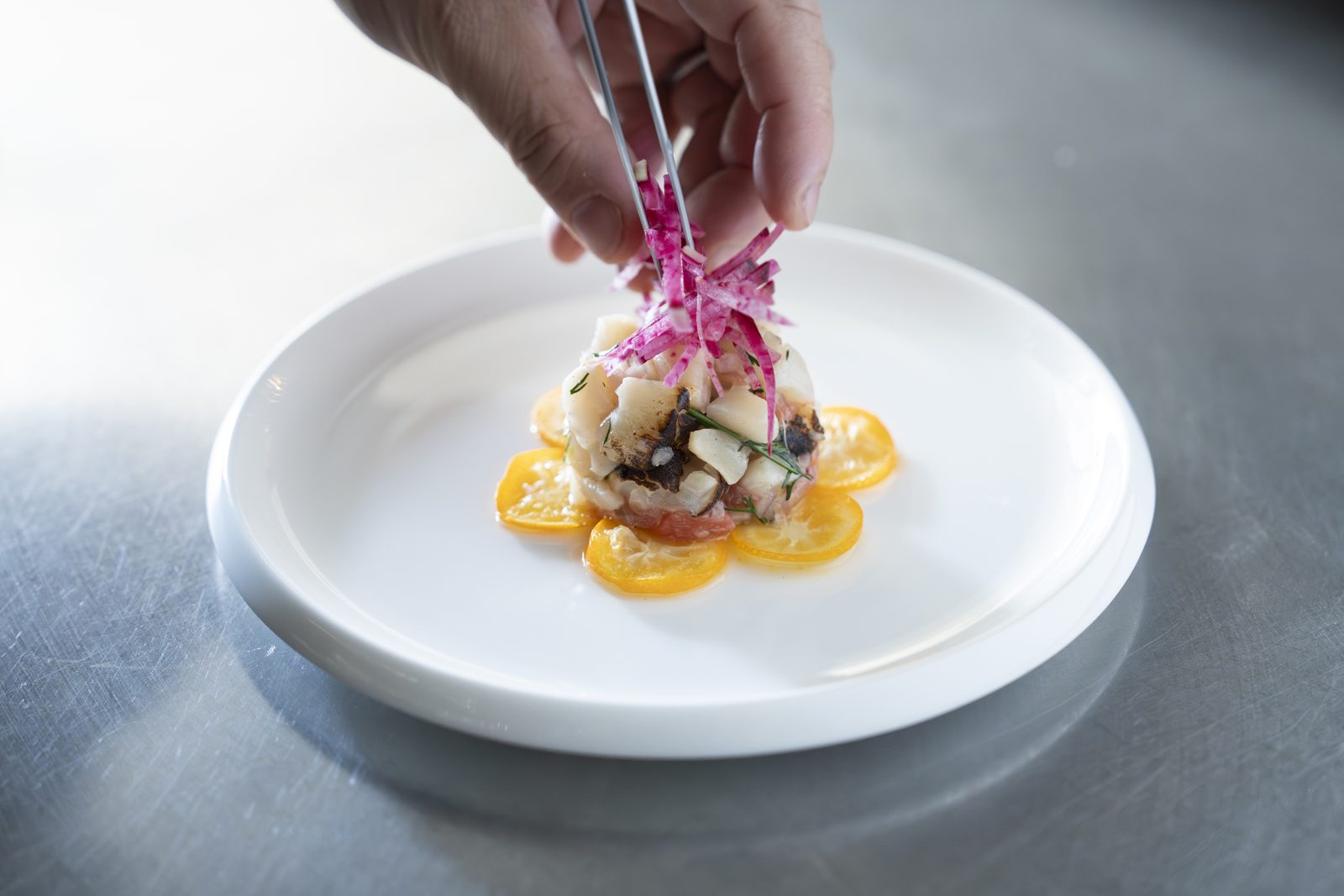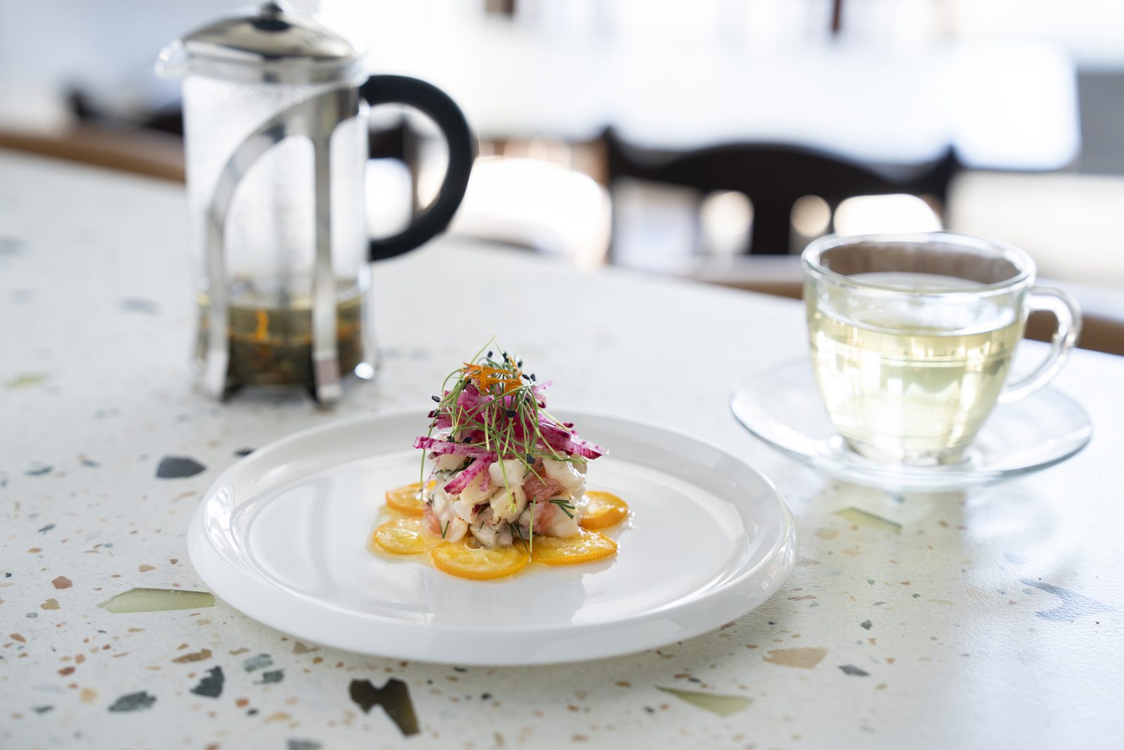 藤井:既製品のハーブティーでは香りが強すぎて料理が負けてしまうことがあるのですが、丹沢HERBSは優しい香りをダイレクトに感じることができるので、素材を活かすことをコンセプトにしているバタコサンクの料理とは相性がいいんです。香りはもちろん、シンプルな素材構成を視覚的にも楽しんでいただけますし、最後に自身でプレスして注ぐことで、ハーブティーを食事と同様の体験として最後までしっかり味わうことができる。みなさん最後までペアリングを楽しんでいただいている印象です。「ひらめき」はレモングラスなどのハーブの香りが楽しめるブレンドなので、今回は柑橘やディルなどと相性のいいハーブを加えた「ホタテと柑橘のタルタル」をペアリングにご用意しました。ホタテとグレープフルーツのタルタルを薄くスライスした金柑の上にのせ、そこに紅しぐれ大根、ニンニクの香りがするロックチャイム、ブレンドにも入っているカレンデュラの花びらをトッピングして、花の色合いも足しています。